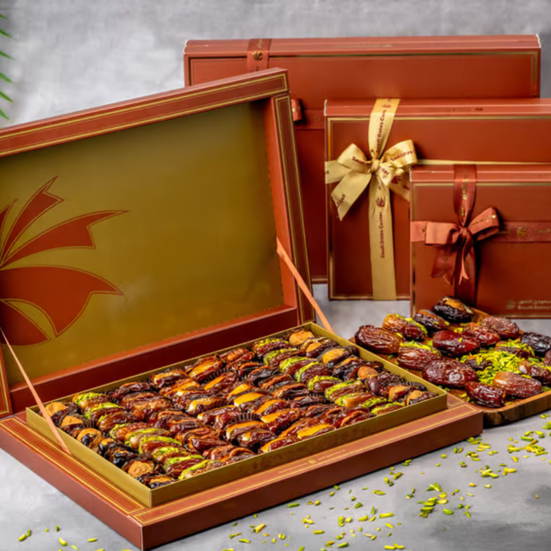 احتفل بالتراث والذوق الرفیع مع صندوق التراث الممیز، المصنوع من الكرتون المتین. ھذا الصندوق الأنیق، الذي یحمل سحره التقلیدي، ھو الخیار المثالي للحفاظ على التمور المحشوة، بما في ذلك تمور مجدول، صفاوي، خضري مع البرتقال، .عنبر، ومجدول مع الفستق