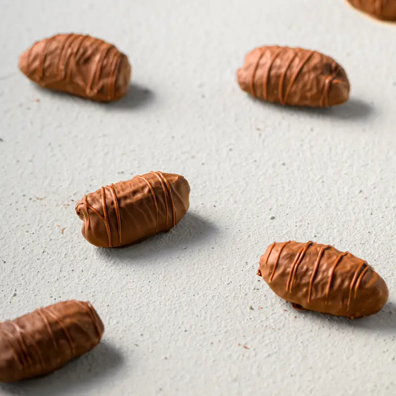 تمر خضري بالبيكان مغطى بشوكولاتة الحليب، يجمع بين دفء التحميص وعمق النكهة الراقية.