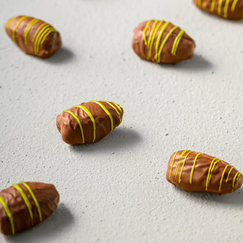 تمر مجدول مغطى بشوكولاتة الحليب ومرصّع بلمسة فستق راقية، يمنح توازناً غنياً يجمع بين النعومة والسخاء.