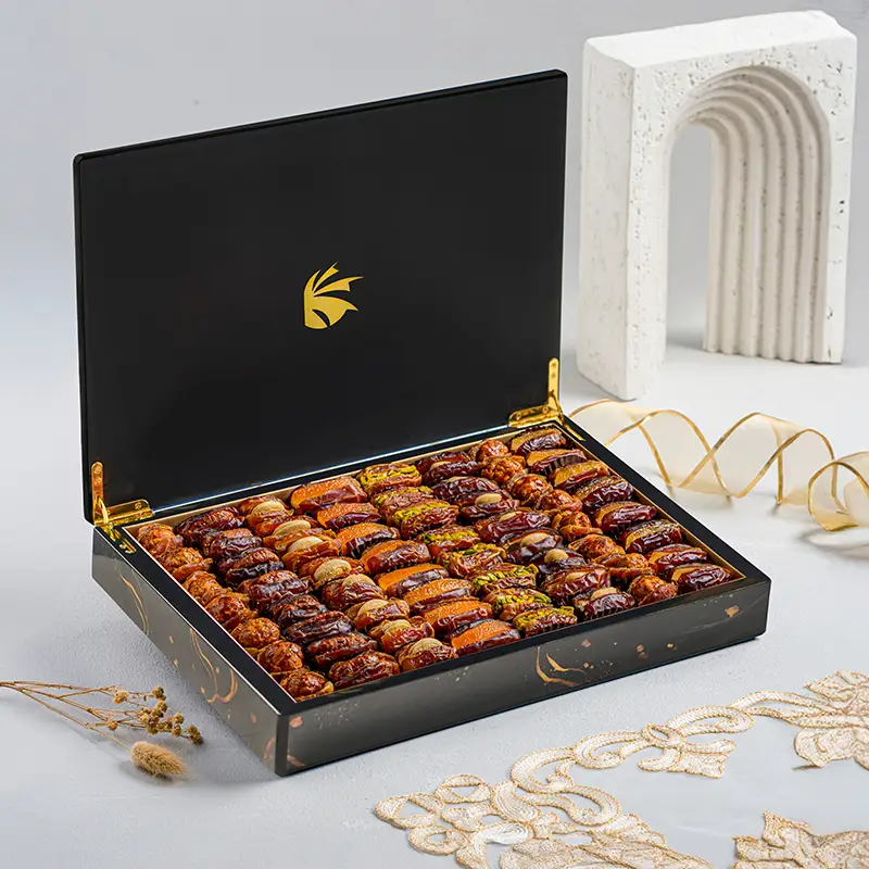 مجموعة فاخرة من أجود أنواع التمور بحشوات متنوعة، مُرتَّبة بعناية داخل هذا الصندوق الخشبي الأنيق، مثالية للمناسبات الخاصة أو كهدية تعبّر عن مشاعر المحبة والاهتمام.