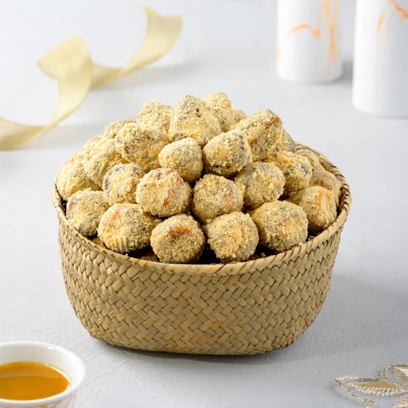 تمور سكري ناعمة محشوة بالطحينة الغنية ومغطاة بحبّات السمسم المحمّص، مرتبة بأناقة داخل سلة زاد. توليفة بطابع شرقي عريق ونكهة لا تُنسى.