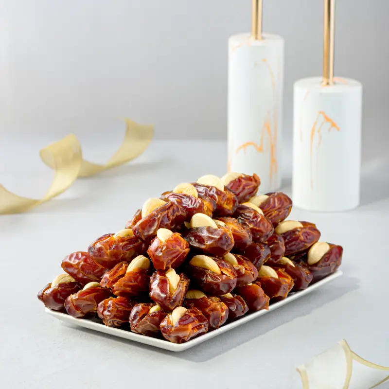 تمور خضري ناعمة محشوة بحبّات الكاجو المحمّص، توليفة فاخرة تجمع بين النكهة الغنية والقرمشة الذهبية.