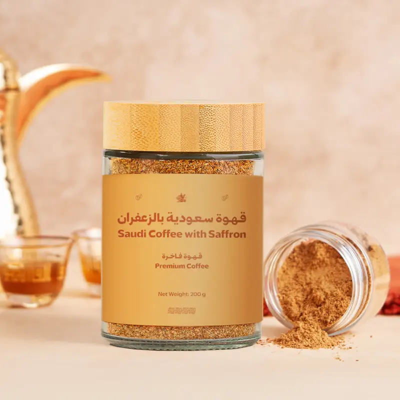 Traditional Saudi coffee infused with premium saffron strands, offering an elegant flavor that embodies authentic Saudi hospitality and warm gatherings.